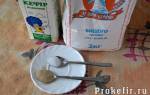 Постепенно вливайте кефир и замешивайте тесто. Сначала удобно перемешивать ложкой, а затем перейти к замесу руками. Завершать процесс лучше на столе. Обратите внимание, что количество кефира может варьироваться.